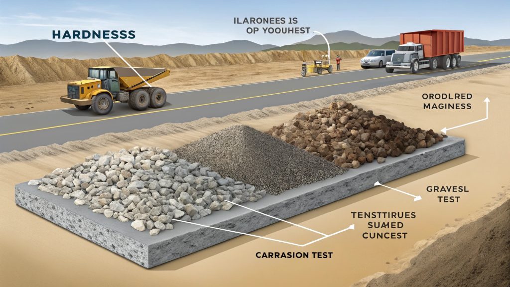 For aggregates, hardness still relates to resisting abrasion and wear. Toughness (or impact value) refers to the aggregate's ability to resist crushing or breaking under sudden loads or impacts from machinery or traffic.
