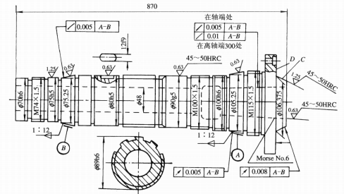 The two support journals A and B of the main shaft are fitted with the inner bore of corresponding bearings, serving as the assembly reference for the main shaft assembly. Their manufacturing precision directly affects the rotational accuracy of the assembly. When the support journals are misaligned, radial runout occurs in the main shaft, which compromises the machining quality of workpieces during lathe operation. Therefore, stringent requirements are imposed on the support journals. **Dimensional specifications**: manufactured to T5 grade standards, with roundness tolerances of 0.005mm and radial runout tolerances of 0.005mm for both journals, along with surface roughness Rα.